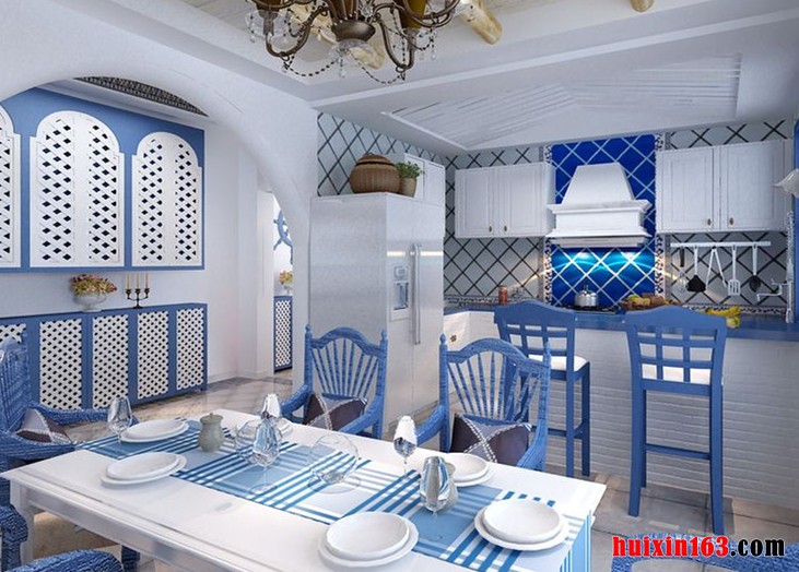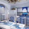 本套为地中海风格装修,一个简洁的餐厅,白色餐桌搭配深蓝色座椅简单而明晰,再用白色的餐具丰富空间色彩,蓝白相间的条纹使整个空间非常利落,蓝色以及白色的线条,使每个细节都会成为和谐,整体地中海风格的格调!餐厅和厨房在一个范围空间内,同样风格装饰下的空间也非常的清爽、活泼。“海”与“天”明亮的色彩,蓝色与白色的四壁、点点滴滴刻画出如海水般的清澈之美。