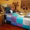 本套为东南亚风格装修,客厅内的沙发选用藤这种自然材质作为主材,全手工编制而成能一下子吸引人们的目光。而且造型上较为简约,不怕搭配过火。搭配彩色的抱枕,别有一番风味。缤纷的玻璃吊灯大大提升情调。红色的窗帘代表了红红火火,整个居室营造出清新幽雅的气氛,同时也适时地表达出带有佛教文化背景的生活情趣。此外经过简约处理的传统家具同样把这种情绪落实到细微之处。